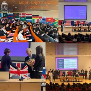💡 Une simulation de débats en français et en anglais : deux jours, 172 élèves des lycées La Bruyère, Marie-Curie et Hoche, tour à tour diplomates, représentants de nations, défenseurs de valeurs et surtout : acteurs de dialogue.  La participation exceptionnelle de Véronique Aulagnon : diplomate, ancienne ambassadrice auprès du Sultanat d’Oman,